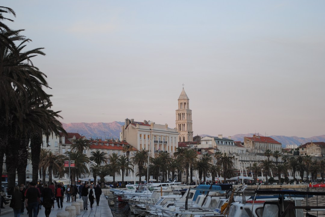 If you go down by the Vestibule, you pass by the stands with souvenirs and walk out directly to Split Riviera. And there, the sun has almost set and it’s crowded with people.
