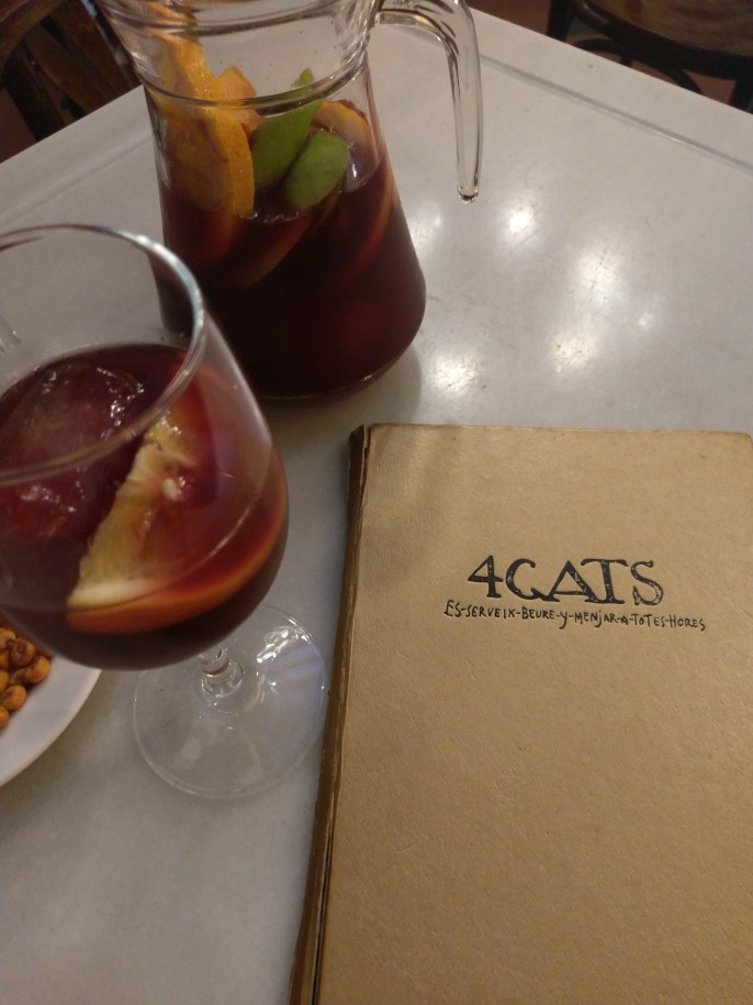 • 4 Gats, presladak restoran u Carrer de Montsió, 3 ulici, koji, sa prekidima, postoji već 120 godina. Posećivali su ga Gaudi, Pikaso, koji je sa 17 godina i nacrtao naslovnu stranu menija. Ne znam da li sam više uživala u sangriji ili u muzici. Posle mnogočasovnog obilaženja grada, restoran je pao kao melem na umorne noge.