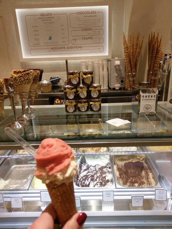 I naravno da sam morala da probam sladoled u Venchi-u. Zanimljiva poslastičarnica sa čijih zidova curi čokolada. Kornet pun čokolade. Ma…prelepo. Prvenstveno se bave izradom proizvoda od čokolade, ali i sladoledi su fantastični.