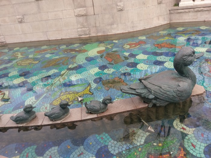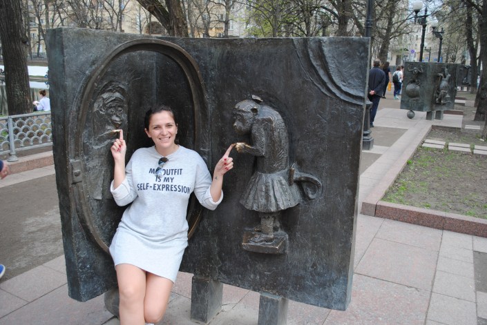 - Patrijaršijski ribnjaci, najurbanija ulica Malaya Bronaya – radnja romana Majstor i Margarita počinje baš u ovom parku. Prva glava nosi poruku – Nikad ne počinjite razgovor sa strancima. Ovu poruku možete videti u parku. Ja je, npr. nisam snimila 😀 Kad smo već kod knjiga – i Lav Tolstoj je u knjizi Ana Karenjina spominjao Patrijarške ribnjake, u delu kada Ljevin traži Kiti na klizalištu. Stvarno je divno kad u sred nekog kvarta, gde vas okružuju samo fasade i ulice, naletite na parče prirode. U parku se nalazi spomenik poznatom basnopiscu, Ivanu Andrejeviču Kirilovu. Dalje od njega, prikazi su junaci njegovih basni. Ja baš sedim u ogledalu i dodirujem majmuna i njegov odraz.