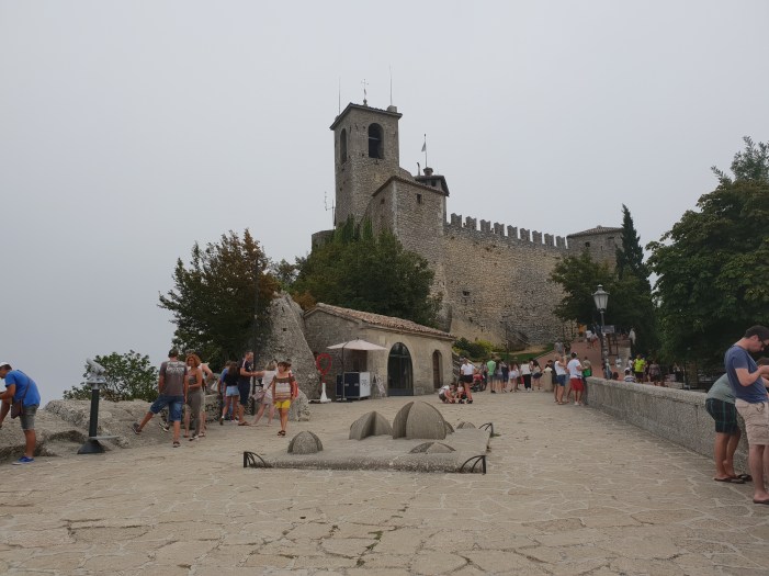 Glavni grad drzave se nalazi na najvišoj tački planine Titano. Pri ulasku u grad, sačekaće vas grb države – tri kule: Guaita, Cesta i Montale. Dočekalo nas je i mnogo maski i nismo bili sigurni da li smo upali u snimanje nekog filma ili se u gradu dešava neki veliki maskebal. Svuda postavljeni štandovi, bina na glavnom trgu, maskirani junaci paradiraju gradom.