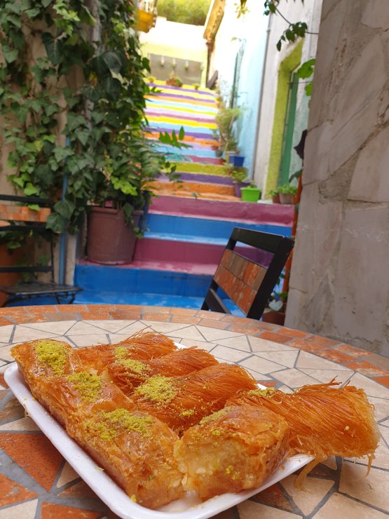 Za odmor od rimskih ostataka u gradu, odabrali smo tradicionalni lokal u glavnoj ulici, naručili kafu, humus, jagnjetinu i nahranili Mihaila bebećom hranom. Kafa je kao i kod nas, samo što dodaju kardamon, aromatični začin.