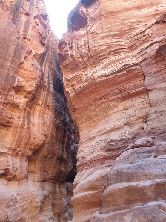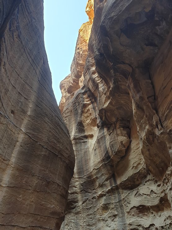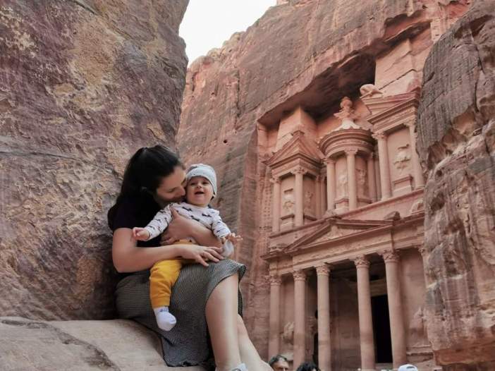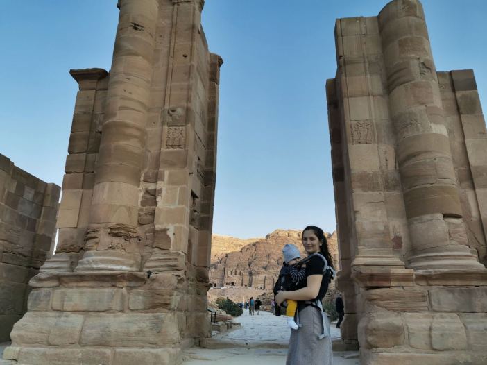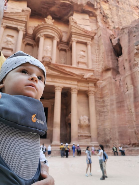Celim putem kroz kanjon imaćete hlad što jako prija pri popodnevnim vrućinama, naročito ako baš tada pešačite sa detetom. Fascinira nas činjenica da su Nebotejci u I veku tako dobro izradili vodovodni sistem. Cevima od terakote prekrivene pločava su prenosili vodu. Da cevi na prelazima ne bi pukle, preračunali su da moraju biti napunjene sa 80% vode, nikako više. U stenama možete videti i isklesane statue bogova, pa shvatamo da je ovaj klanac, pored puta za trgovačke karavane, imao i religioznu ulogu. Usput rećemo mnogo ljudi koji komentarišu bebu u obilasku Petre. Mnogi sa balkanskog govornog područija.