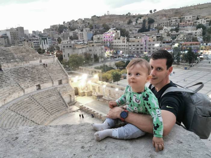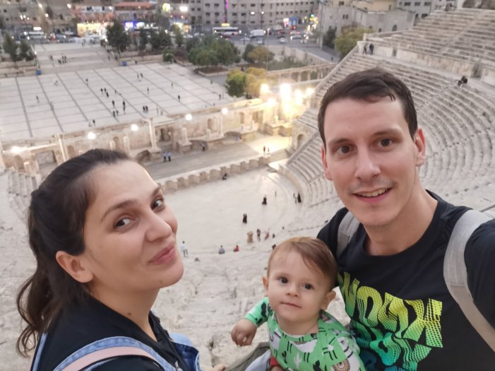 Sleteli smo u Aman nakon 3 i po sati leta i nestvarnih prizora iz aviona. Kupili Mihailu vizu, pokazali naše unapred kupljene Jordan Pass-ove, sačekali kofere, kolica i auto sedište i uputili se ka šalteru rent-a-car kompanije. Prva dobra stvar – dobijamo auto za klasu bolji od onog koji smo rentali. Odmah nam je jasno da su, za razliku od Evrope, ovde vrlo liberalni kad su ogrebotine u pitanju. Nekako je ispalo da je ovde rentanje auta jako opušteno i da nemaju nameru da vam iskamče dodatne pare za osiguranje skoro pa preteći, kao na Sardiniji. Konačno smo sve popakovali i krenuli ka smeštaju. Smeštaj se nalazi odmah preko puta rimskog amfiteatra. Parkiramo auto u blizini, na javnom, besplatnom parkingu, ulazimo u smeštaj, kupujemo kanafe i krećemo u obilazak grada. Prvi utisak je da skrećemo pažnju. Zanimljivi smo prolaznici, očigledno. Da li zbog mojih tregerki ili zbog Mihaila ili sve skupa, pak, ne prolazimo neprimećeni.