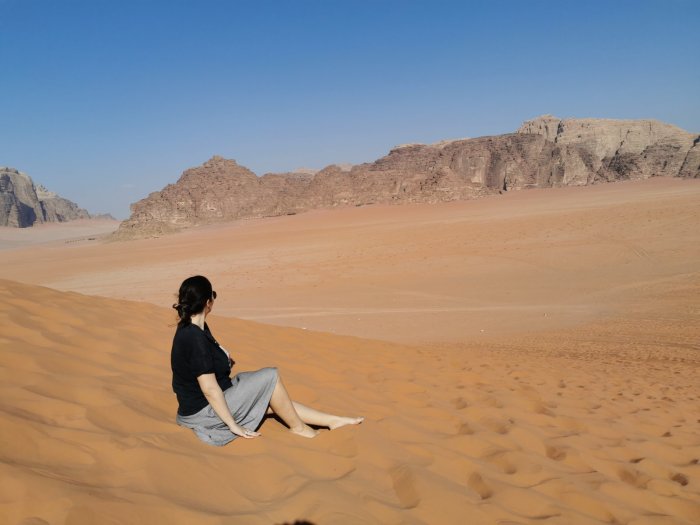 Poslednju lokaciju preskačemo, jer vidimo da je Mihailu već dosta ovog truckanja. Možda je trebalo da odaberemo 2 sata obilaska umesto 4. Da biste uživali u zalasku sunca, morate da doplatite 15 JD…tako da smo to preskočili. Naš vozač priča kako svi žive u beduinskom selu, u blizini gde smo ostavili auto. Ima petoro dece i šesto je na putu i zadovoljni su životom koji im je ovde omogućen. Kaže da često viđa kraljevsku porodicu u poseti pustinji. Pita nas da li nam je ovo jedino dete i konstatujemo da je u Srbiji uobičajno da porodice imaju maximalno dvoje dece, što on shvata kao lošiji ekonomski status države u odnosu na Jordan.